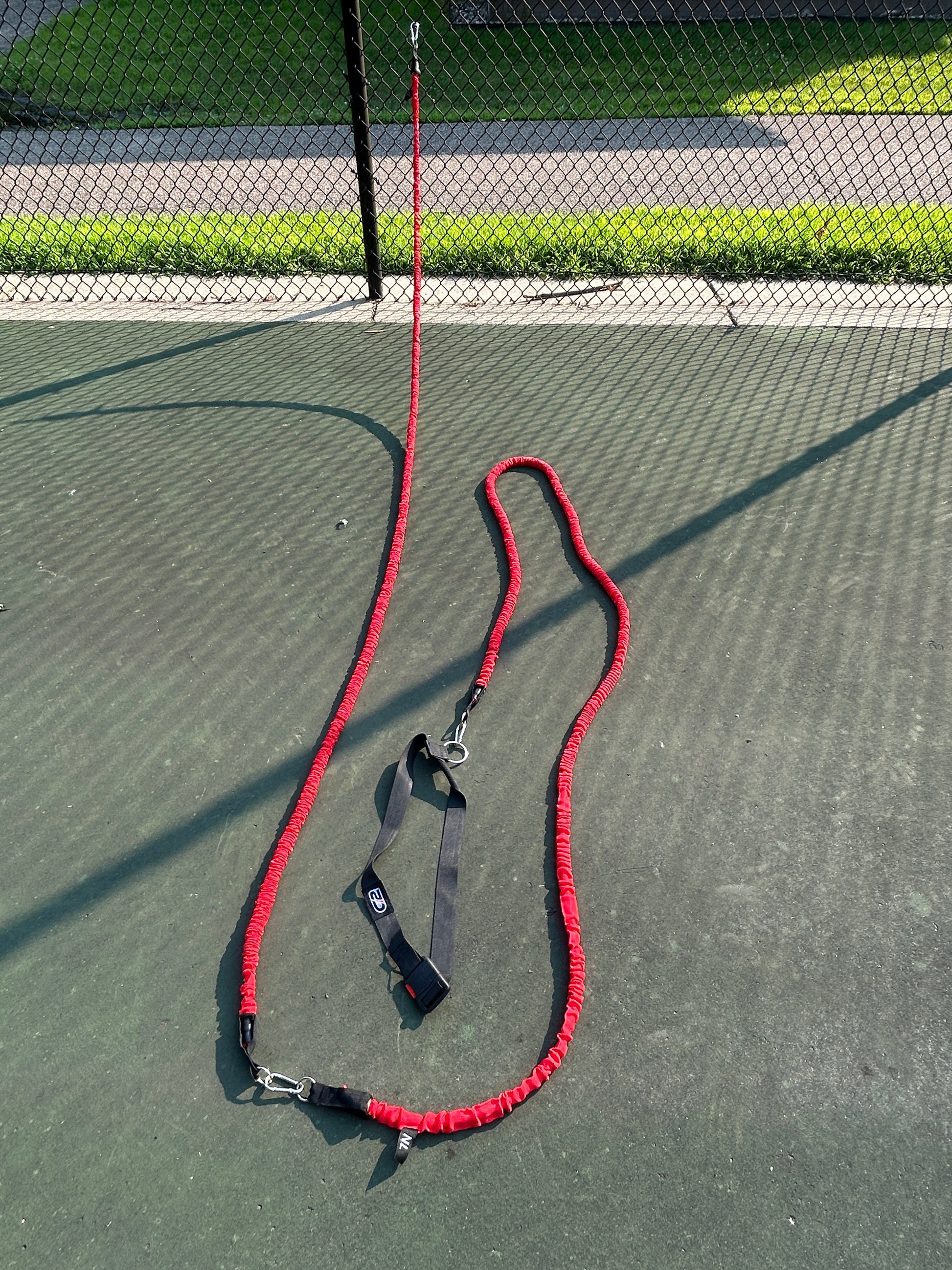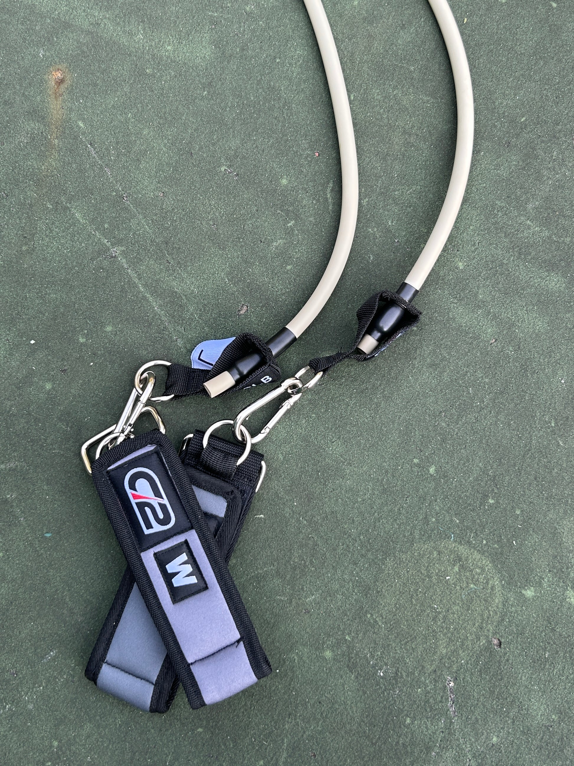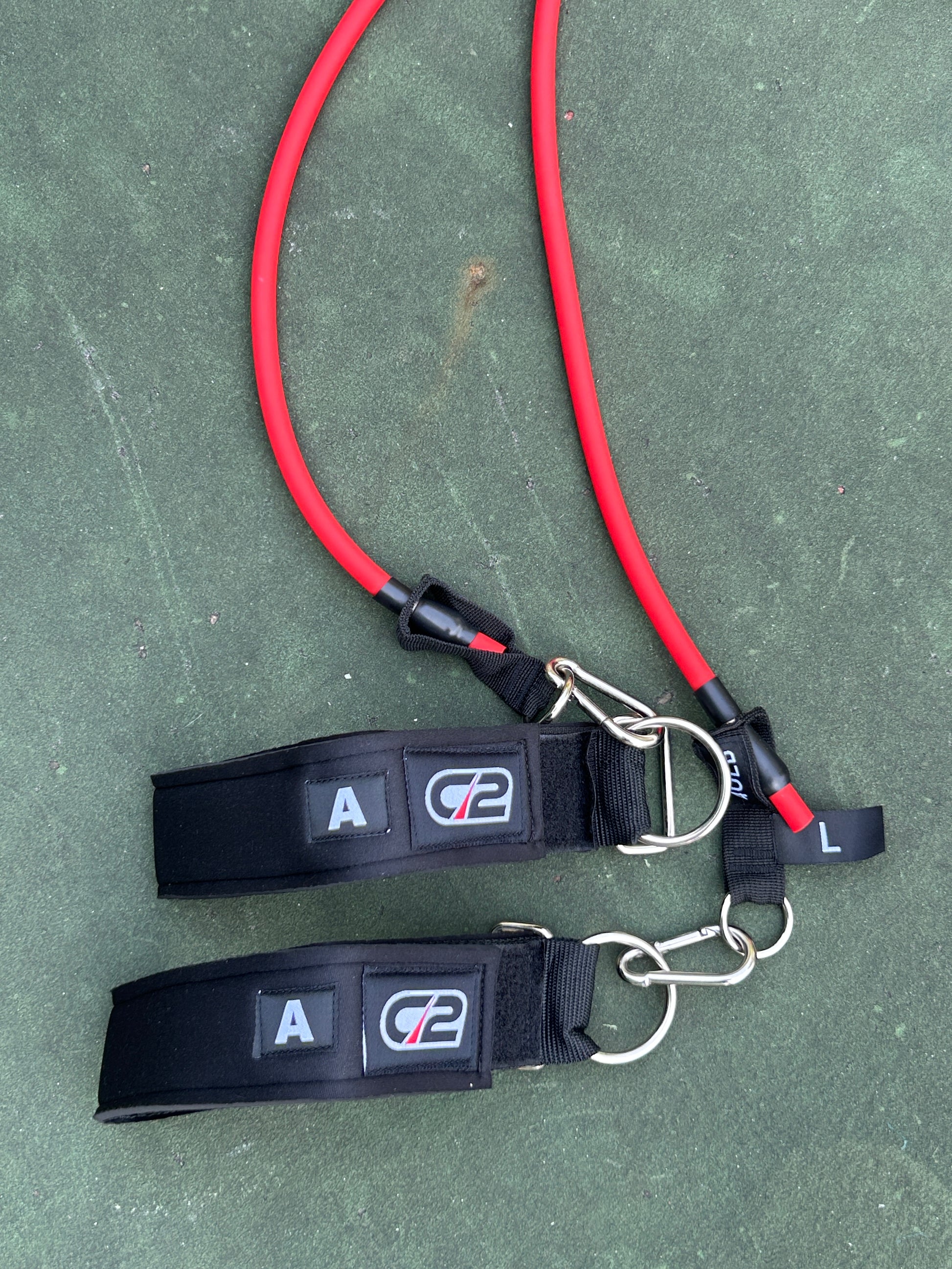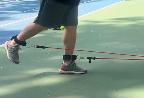 Ankle cuffs allow you to activate the hip flexors. Wrist cuffs activate the core and shoulder muscles. The hitting harness is rotational training aid for forehands and backhands. The Speed Belt and sleeved bands are for playing and volleying. You can play pickleball while hooked up to 10-foot bands. This will challenge your cardio.
